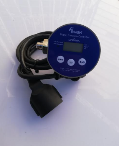 Evak DPC 10A digitális szivattyú nyomáskapcsoló ami kiváltja a mechanikus nyomáskapcsolót. A nyomáskapcsoló dugvillával és dugaljjal szerelt. Egyszerűen össze kell dugni a szivattyúval. Minden felszíni és búvárszivattyú vezéreltethető ami nem haladja meg a 2,2 kW-ot. AZ Evak DPC 10A digitális nyomáskapcsolón be lehet állítani a ki és bekapcsolási értéket is. Szárazon futást is képes érzékelni nyomásérték alapján. Ha fontos, hogy a rendszerben bizonyos érték alá nem eshet a nyomás akkor beállíthatjuk. Az Evak DPC 10A nyomáskapcsolóhoz minden esetben kell használni hidrofor tartályt, legalább akkorát, hogy a vízütés ne tudjon kárt tenni a rendszerben vagy a szivattyúban ez általában a térfogatáram 10%-a. Az Evak DPC 10A kijelzője megvilágított, akár esti órákban is be lehet állítani.